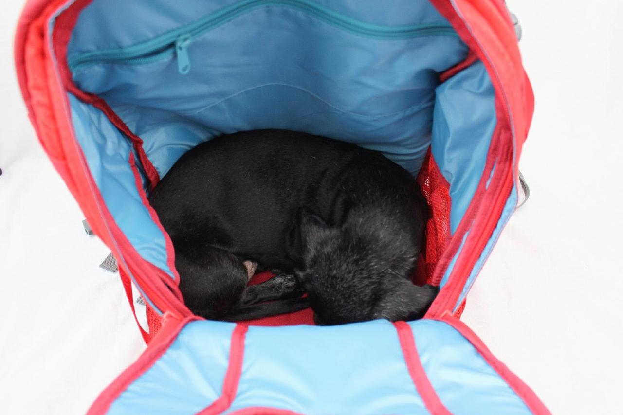 To get your dog into the bag, place the backpack